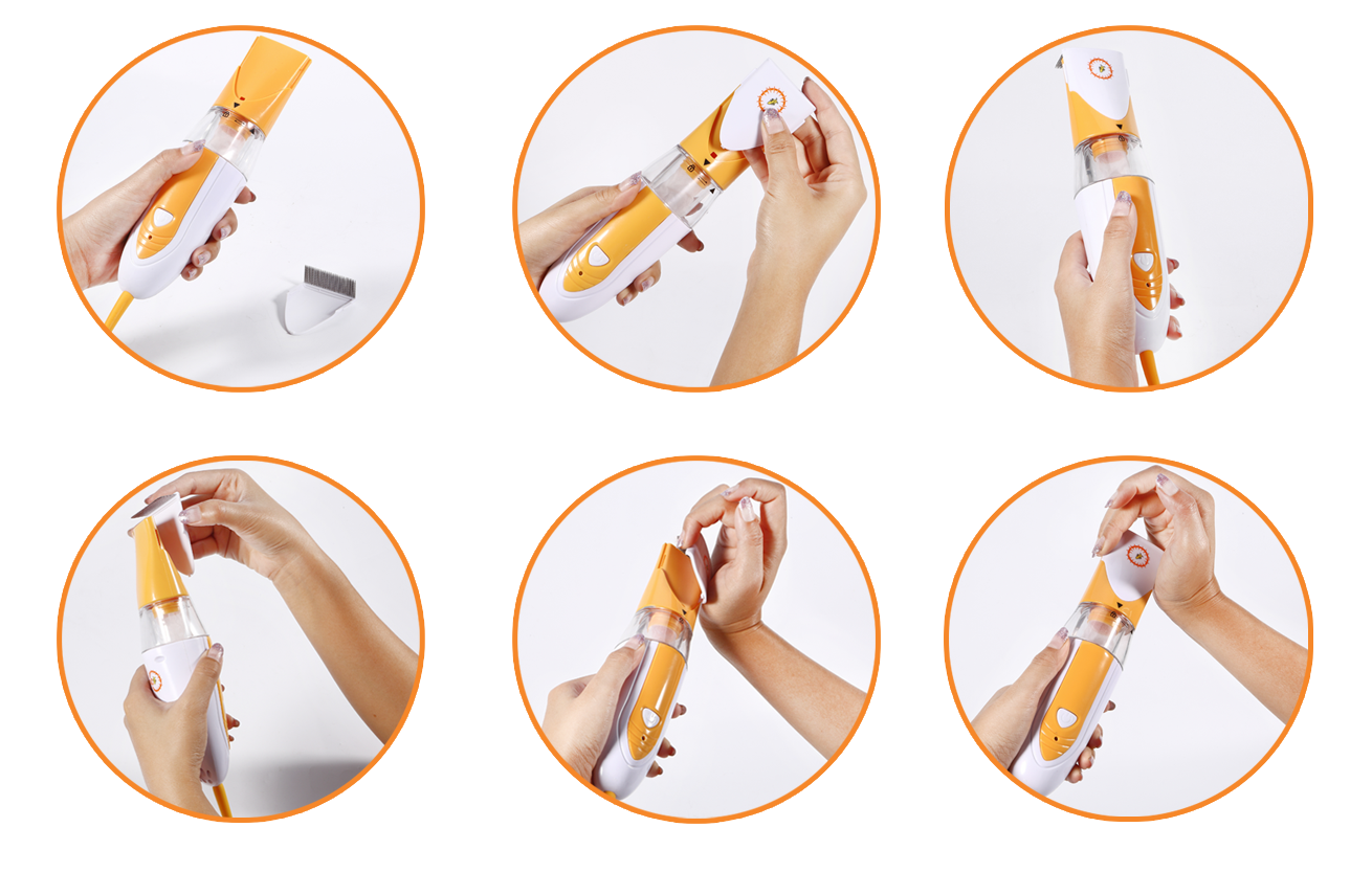The Licevac works best on dry hair. Simply attach a fresh capture nets securely to the Licevac combing head, ensuring it snaps into place (you will hear a click) and reattach the combing head to the main body by aligning the guiding arrows and twist to lock.
